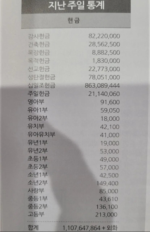 이 통계를 보면, 교회는 막대한 금액의 헌금을 통해 재정을 운영하고 있음을 알 수 있습니다. 특히 십일조 헌금의 경우 863,089,444원으로 가장 큰 비중을 차지하고 있으며, 이는 교회의 주요 재정 원천임을 시사합니다.